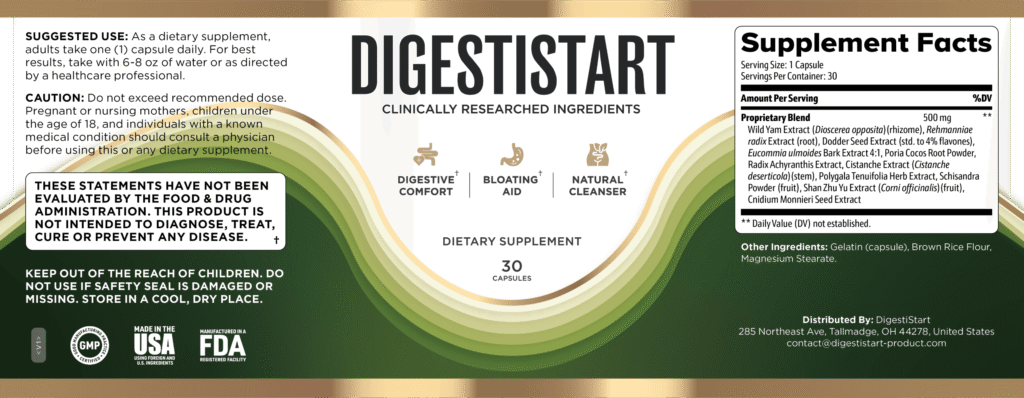 DigestiveStart is a dietary supplement designed to support digestive function and enhance the body’s ability to break down and absorb food. Its primary aim is to promote gastrointestinal comfort by reducing bloating, heaviness, and slow digestion. The formula was created to deliver balanced, accessible, and convenient daily digestive support.